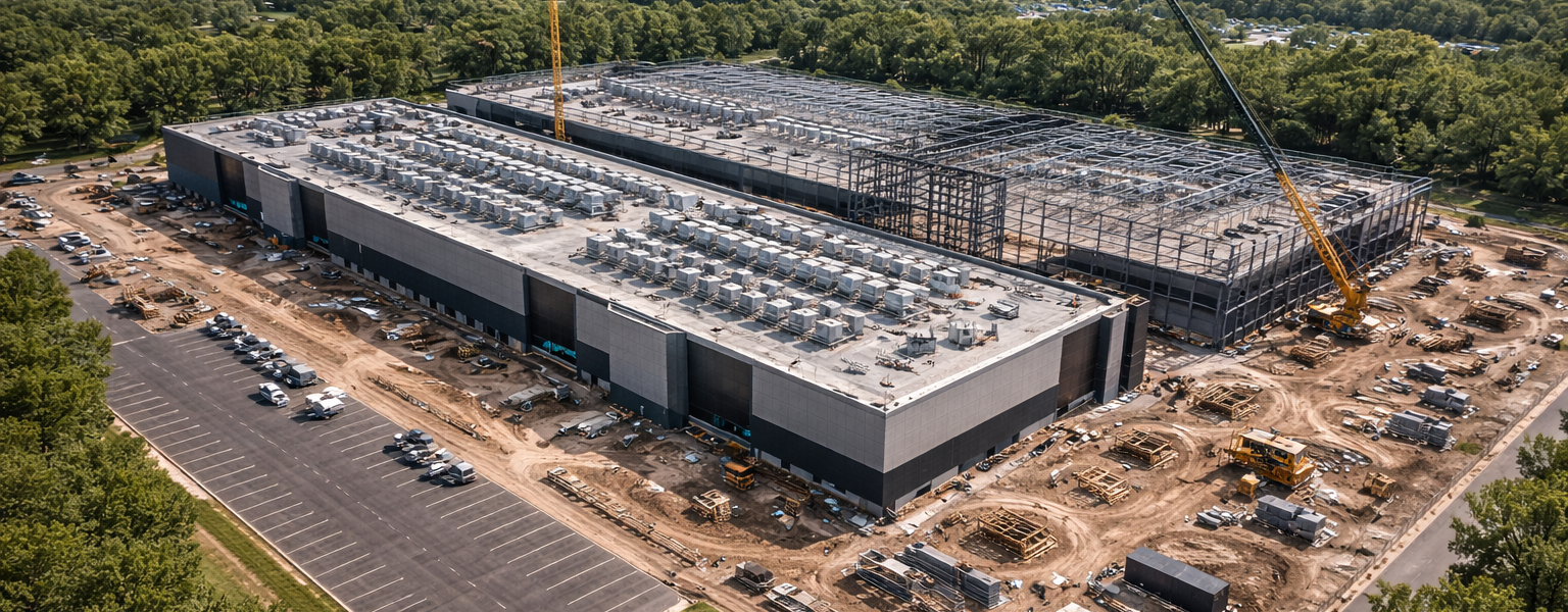Structural steel in data centres requiring certified fire protection and efficient execution.